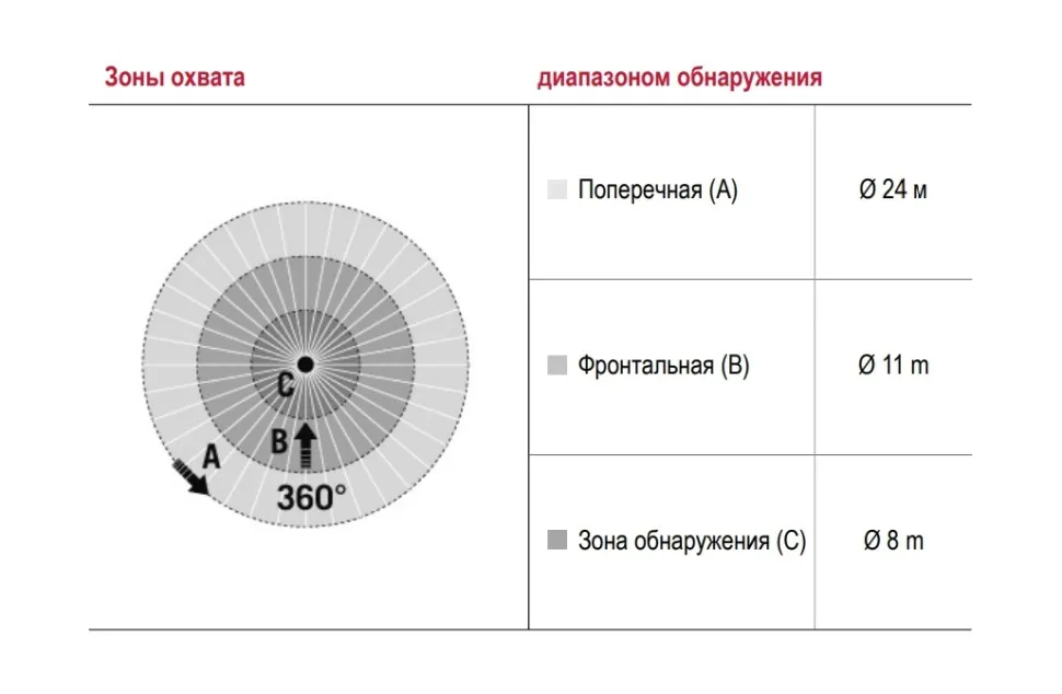 | Угол охвата, диапазон обнаружения | Ø 8 м |