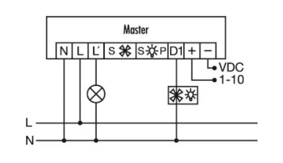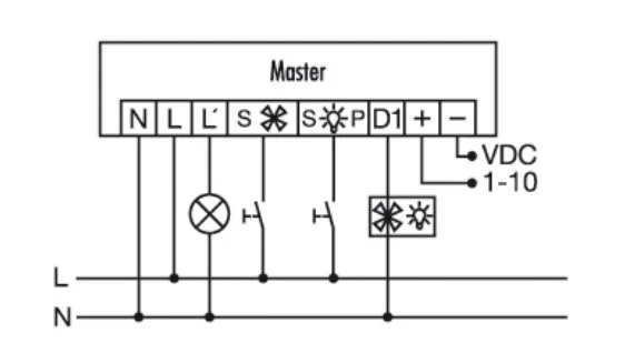 - Автоматическая регулировка освещенности (канал 1) на постоянный уровень яркости (высота до 5 м) в зависимости от присутствия и дневного света (1 - 10 В = Интерфейс)