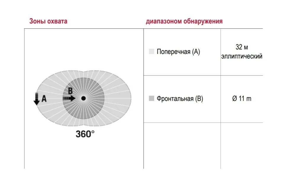 - Дальность до 32 м, эллиптическая дальность обнаружения 32 м в длину и Шириной 4 м при высоте установки 10 м (максимальная высота установки около 10 м)