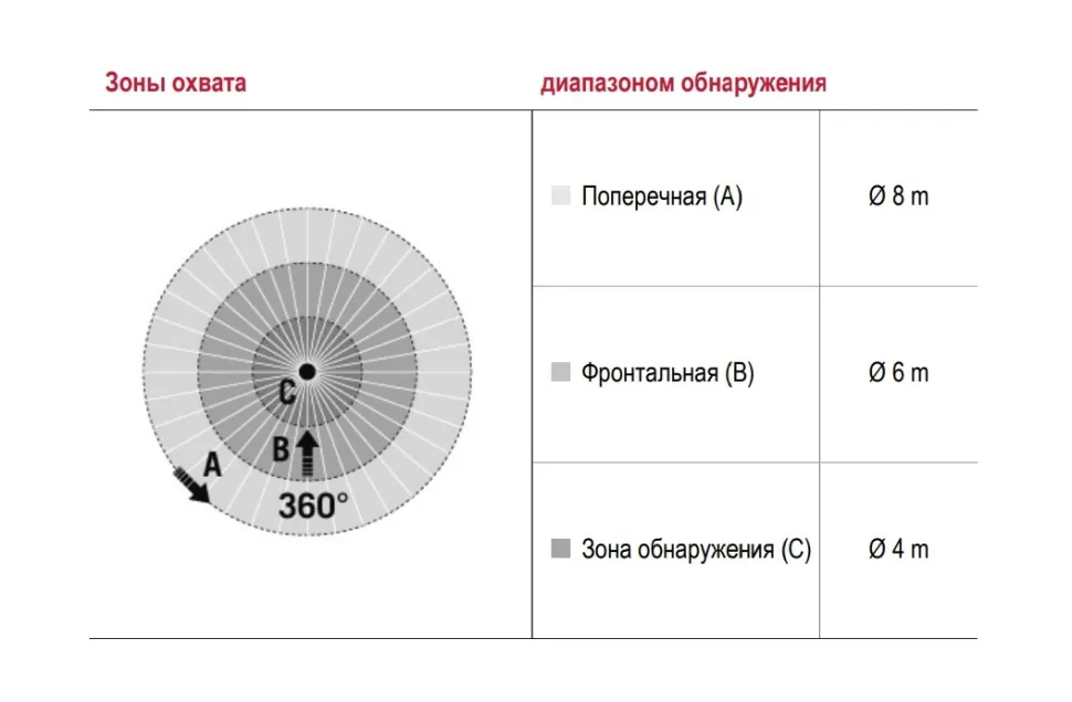 | диапазоном обнаружения Фронтально | Ø 6 м |