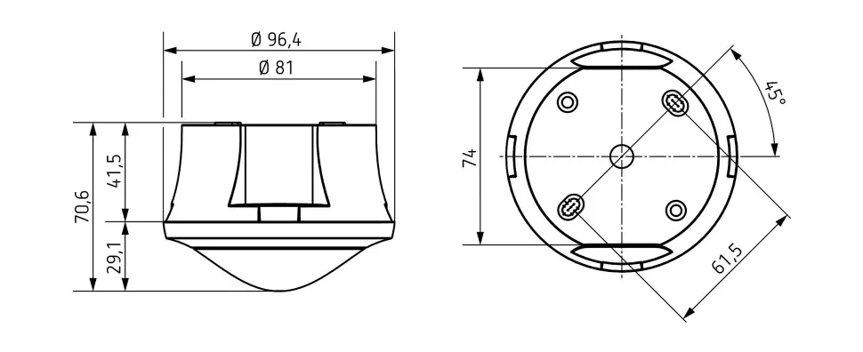 • Круглая зона обнаружения 360°, до Ø 9 м (64 м2)