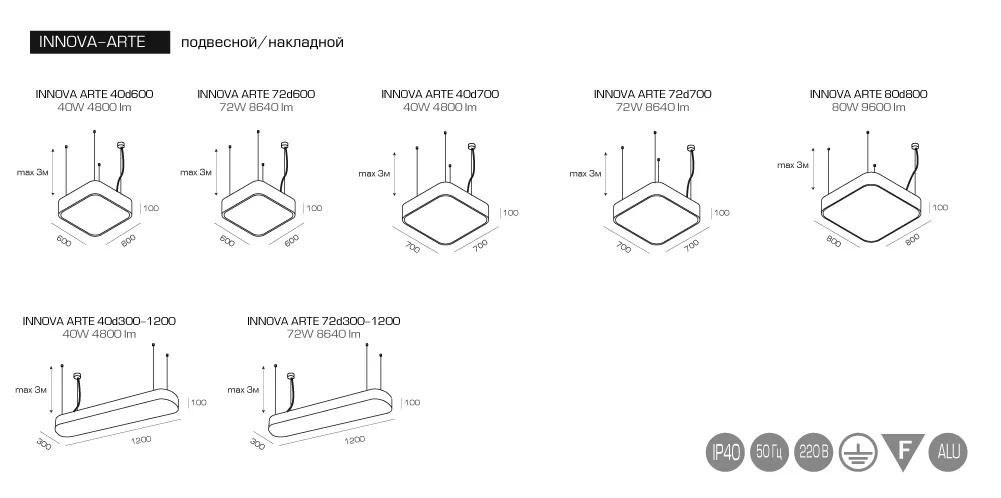 | 1 | INNOVA ARTE 40L600 | блок питания TRIDONIC | 40 Вт | 4800 Лм | 5000K / 4000К / 3000К | 600x600x100 мм |
