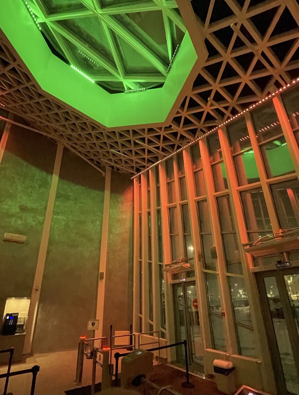 Важную роль в оформлении комплекса играют световые элементы. Светодиодные RGBW-прожекторы были установлены внутри стеклянных конструкций входного павильона музейного комплекса. За счет этого в темное время суток создается динамический эффект заливки помещения светом.